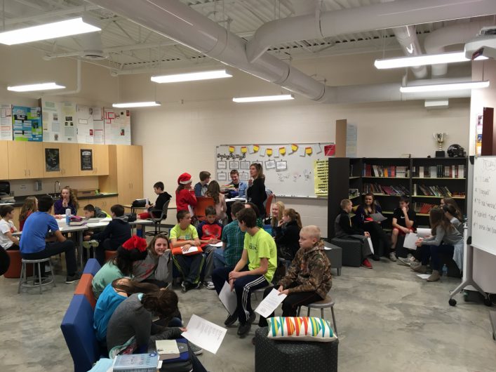 All students participated in a “Poetry Pow-Wow” on Thursday, December 22nd. This allowed for all students of all grades to share their poems with each other multiple times throughout the day and even consisted of the eighth graders teaching a lesson on SLAM poetry! We ended the day with student volunteers reading their poems to the entire school. It was exciting to seeĀ students show off their creative poetry skills with each other and learn more about each other – across grade levels!