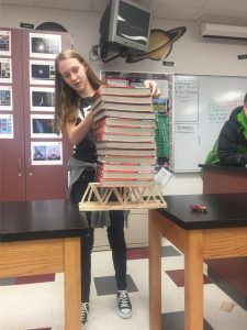 Ella Grossman testing her bridge. Each textbook weighs 3 pounds!