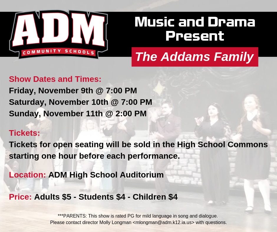 ADM Music and Drama present a fun musical comedy that features all the Addams Family characters you know and love. The student musical will feature a cast and crew of over 60 ADM students showcasing their talents for the ADM Community. Come enjoy the show which will feature all your favorite Addams Family characters: Morticia, Gomez, Wednesday, Pugsley, Lurch, Grandma Addams, and Uncle Fester. Nothing is scarier to this family than normalcy, and that’s exactly what they get when Wednesday falls in love with the perfectly normal Lucas Beineke. Will the family survive? Will love prevail? Come find out!