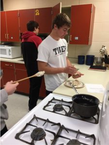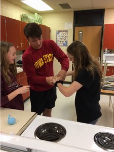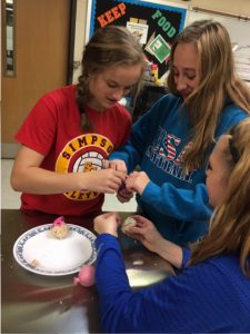 Students in Mrs. Scott’s health class have fun making stress balls. A stress ball filling in first mixed, then placed inside balloons. Students help each other as they stuff their stress balls.