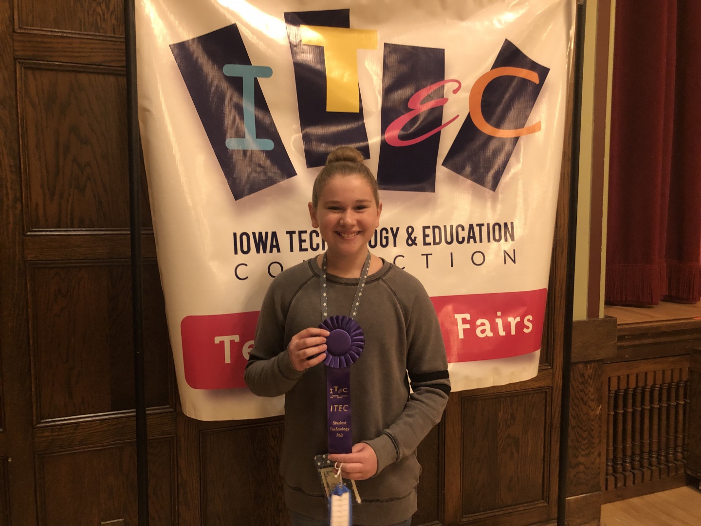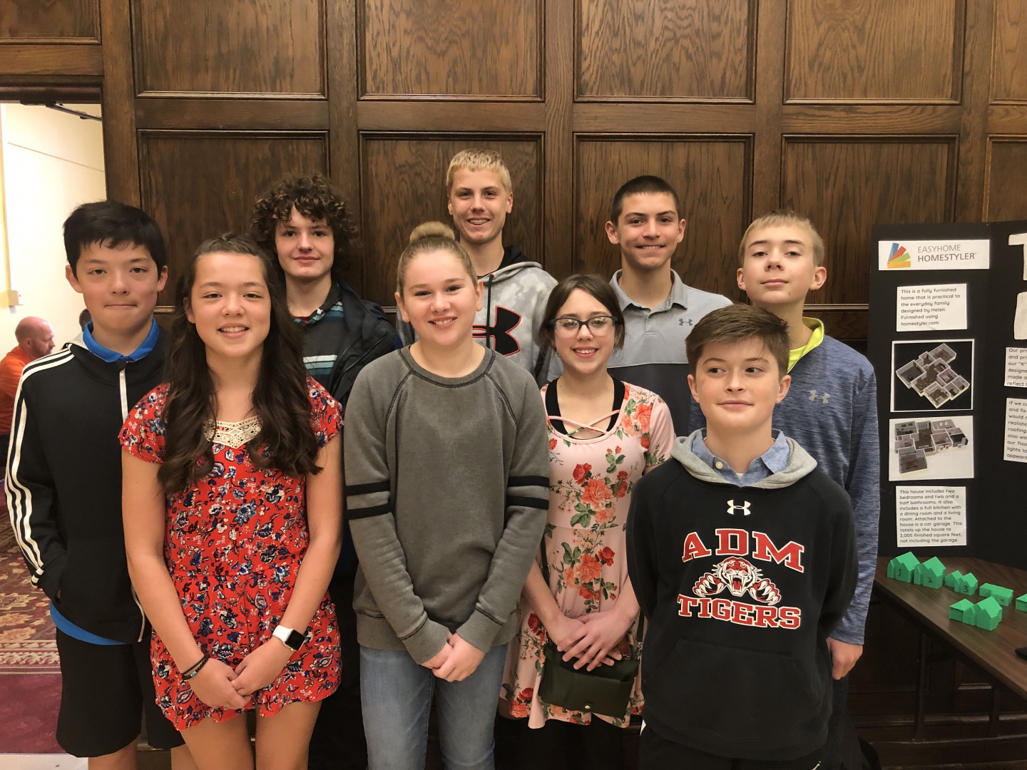On Thursday, April 25, nine students from ADM middle school presented projects at the Central Iowa Technology Fail in Ames, Iowa. The Central Iowa Technology Fair offers K-12 students an opportunity to showcase technology-based projects. Projects submitted span eight different categories including web presence, programming, video/linear presentation, graphics/publishing, 3D rendering/non-linear animation, music/sound design, mobile apps, and innovative technology use. Each project is reviewed by a team of judges and is given a score and ribbon.