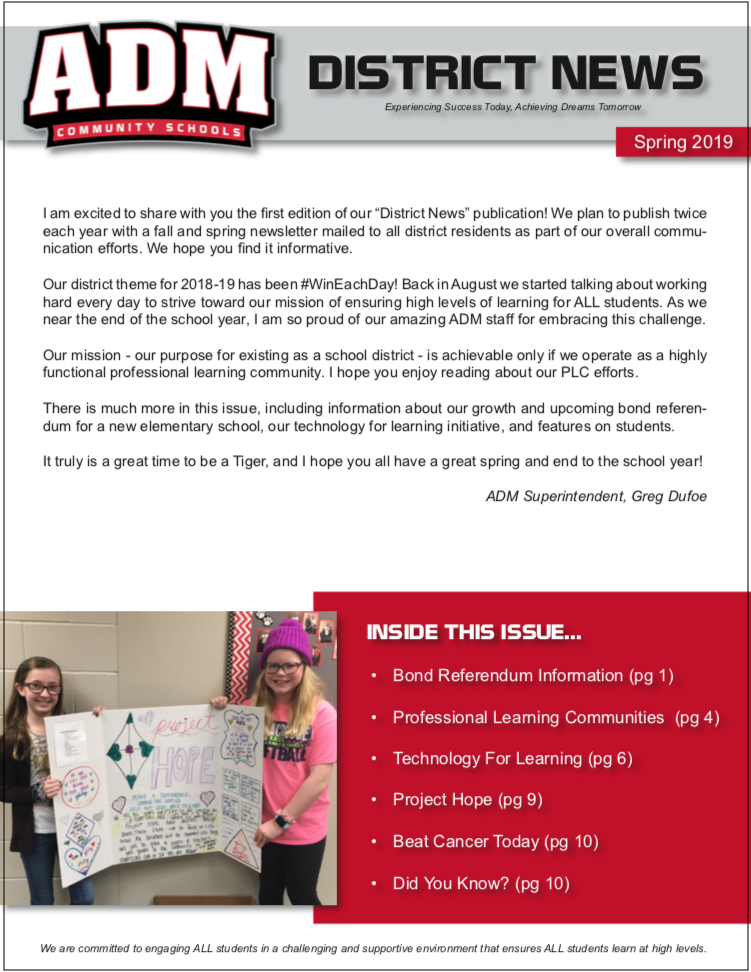 ADM is excited to launch a new publication that the district intends to mail to all ADM residents each spring and fall. ADM residents should receive a print copy of “ADM District News” the week of May 6th. Find the following in the spring 2019 issue: