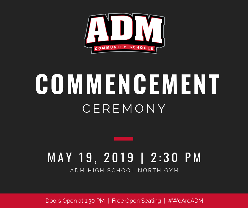 ADM’s High School Commencement will be held on Sunday, May 19 at 2:30 PM in the ADM High School North Gym. Doors will open at 1:30 pm. Open seating is available for all guests at no cost during the graduation ceremony.