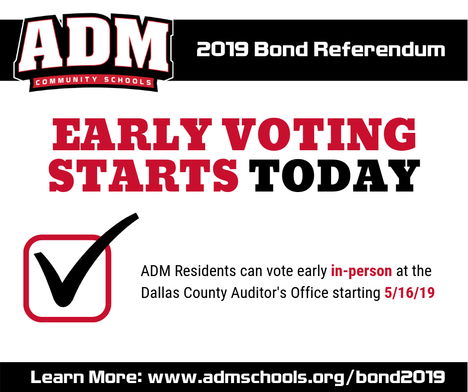 Early Walk-In Voting Starts On May 16th. ADM residents may begin walk-in early voting for the 2019 bond referendum. All early walk-in voting must be completed at the Dallas County Auditor’s Office, 210 N. 10th Street, Adel, IA.