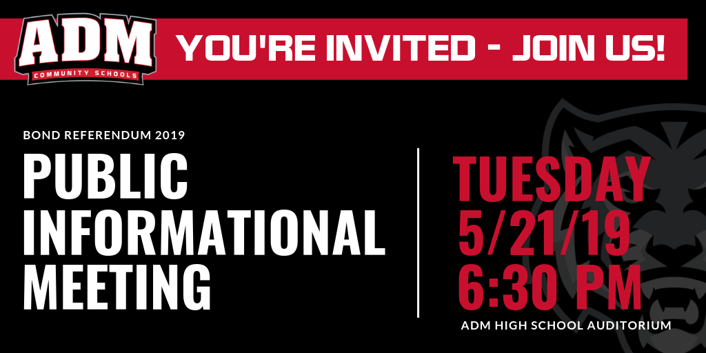 Reminder: ADM will host a Public Informational Meeting on Tuesday, May 21st at 6:30 PM about the upcoming June 25th Bond Referendum. The meeting will take place in the ADM High School Auditorium. Please plan to join us!
