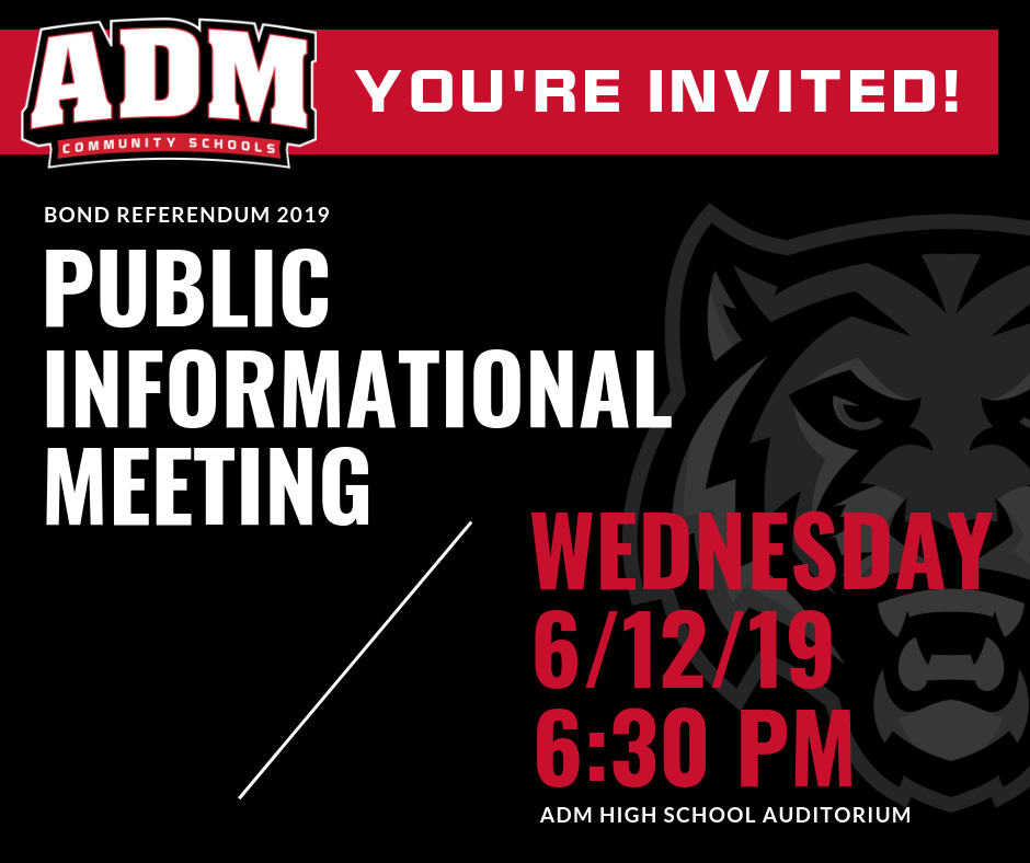 Reminder: ADM will host a Public Informational Meeting on Wednesday, June 12th at 6:30 PM about the upcoming June 25th Bond Referendum. The meeting will take place in the ADM High School Auditorium. Please plan to join us!