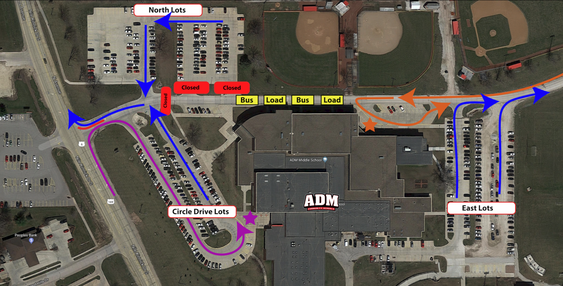 - All traffic entering the front side of ADM MS/HS during dismissal times will be diverted into the circle drive lot. (See purple arrows on building on map below)