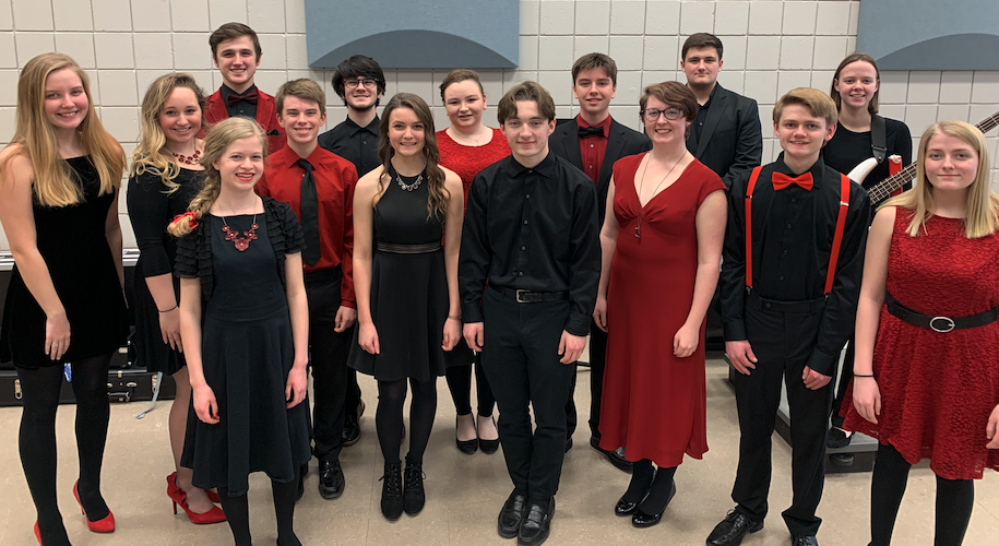 Students have worked hard for the honor and are excited to see what the competition holds for them. The group is made up of seniors Nathaniel Aukes and Holland Zwank in the rhythm section, Olivia Klassen, Katarina Meadowcroft, Mikki VerWoert, Anna Walls, and Max Weesner; juniors Brennan McGee, Megan Olson, Cash Riker, Noah Stewart, and Sean Whitson, and sophomores Averi Brady, Michael Payne, and Maya Shirley-Brown. Amp was previously selected for the Iowa Vocal Jazz Championships in 2014-2017, receiving as high as 3rd place honors in 2016.