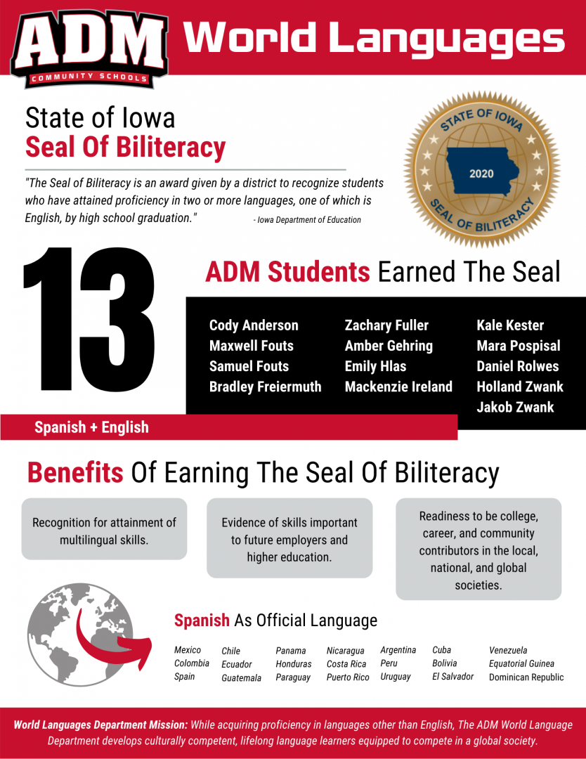 This year ADM had 13 students earn the Iowa Seal of Biliteracy by demonstrating of proficiency in English and Spanish. Join us in congratulating ADM students Cody Anderson, Maxwell Fouts, Samuel Fouts, Bradley Freiermuth, Zachary Fuller, Amber Gehring, Emily Hlas, Mackenzie Ireland, Kale Kester, Mara Pospisal, Daniel Rolwes, Holland Zwank, and Jakob Zwank on the achievement!