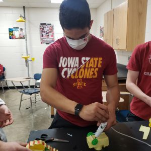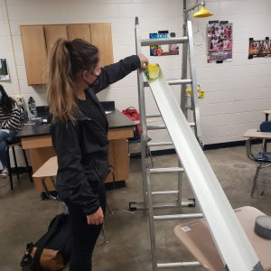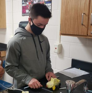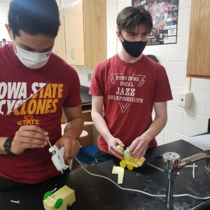 The challenge: To design a safety device that can hold an egg (passenger) on the model car and keep it from breaking as the car rolls down the ramp at increasing slopes. The target goal is to protect the egg during a roll down the ramp at a 50-degree angle without cracking.
