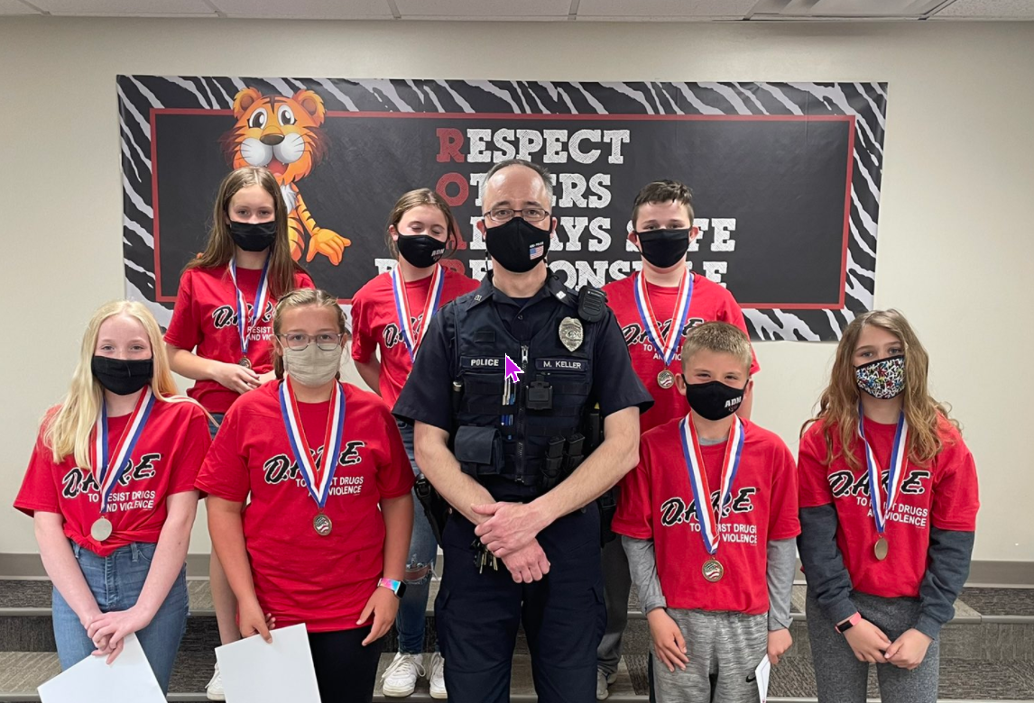 On Friday, April 16th, DeSoto Intermediate students celebrated the completion of their DARE program and participated in a class ceremony that included a video of Mrs. Banse and Mrs. Hemphill reading excerpts from the winning DARE essays. Throughout this program, Officer Keller led our students in learning about the harmful effects of drug/alcohol use and peer pressure, and DeSoto Intermeidate students were equipped with a decision-making matrix that will support them in making positive and healthy choices in their futures. Pictured below are the winning essay writers; way to go 5th graders!