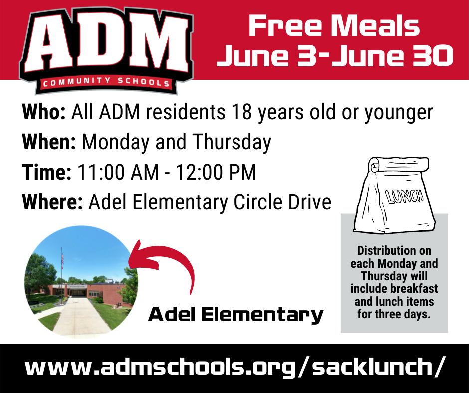 When: Meals can be picked up in the Circle Drive at Adel Elementary from 11:00AM-12:00PM each Monday and Thursday.