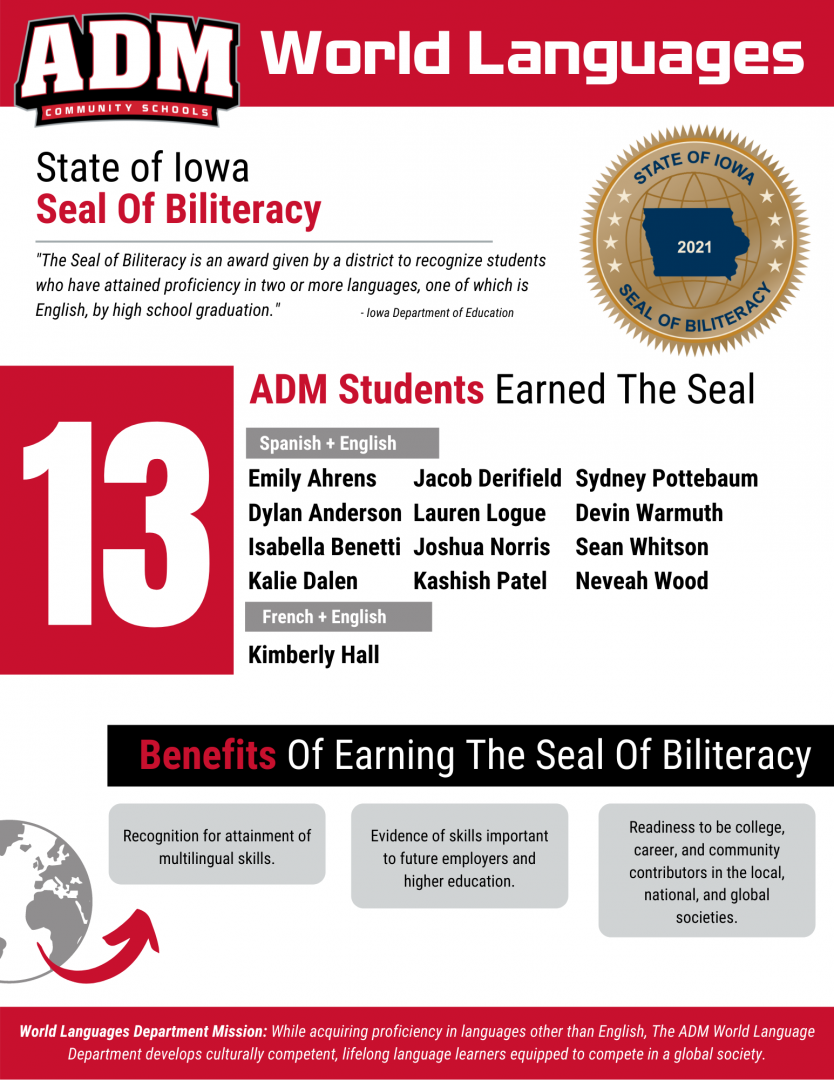 - This year ADM had 12 students earn the Iowa Seal of Biliteracy by demonstrating of proficiency in English and Spanish: Emily Ahrens, Dylan Anderson, Isabella Benetti, Kalie Dalen, Jacob Derifield, Lauren Logue, Joshua Norris, Kashish Patel, Sydney Pottebaum, Devin Warmuth, Sean Whitson, Neveah Wood