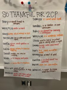 Thanksgiving is a time where we give thanks for all the things we have. Second grade students in Mrs. Cole/Paul’s class were surprised by the chart their teachers created on Tuesday. Each student’s name was listed on a large chart where it said why their teachers were thankful to have them in class.