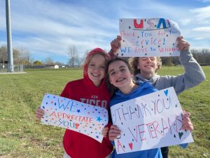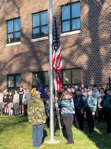 On Thursday, November 11, the Middle School staff and students thanked local active service members and veterans with a Veterans Day Celebration. We welcomed our visitors with morning donuts and coffee. We’d like to thank The Rooted Bean for donating coffee to serve as well as gifting each of the visitors with a bag of their “Hero” blend. After coffee, the local American Legion Post 454 presented the colors at a flag raising ceremony. Traditional taps were performed by student Nic Fuller.