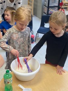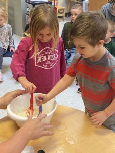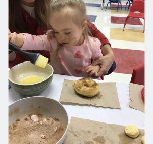 Three year old preschool students have been actively engaged in their Bread Unit since January. During this unit, students have had the opportunity to learn about ingredients, measurement, following a recipe, sequencing, while also exploring through baking a variety of bread/dough treats! Students are able to compare recipes, create their own, and are provided multiple opportunities for hands-on learning experiences.