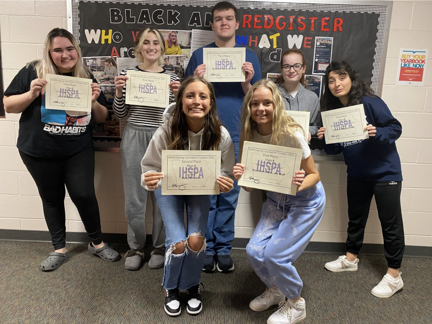 Haley Gonzalez, Brookelyn Evans, Taylor Macallister, Chris Aukes, Dominic Gardiner, Rebecca Beaman, and Keto Chikvaidze proudly display some of their IHSPA spring journalism contest awards.