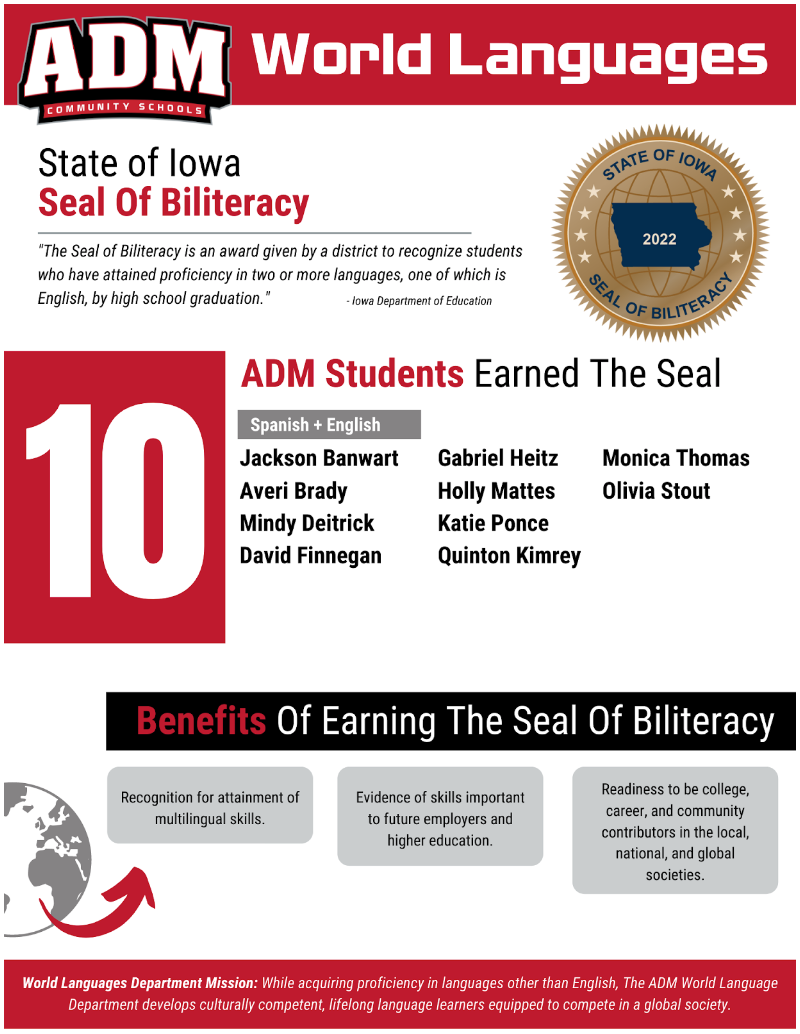 This year ADM had 10 students earn the Iowa Seal of Biliteracy by demonstrating proficiency in English on the ISASP assessment and Spanish with a score of 5 or higher in each area of the STAMP Test. Join us in congratulating ADM students Jackson Banwart, Averi Brady, Mindy Deitrick, David Finnegan, Gabriel Heitz, Holly Mattes, Katie Ponce, Quinton Kimrey, Monica Thomas, Olivia Stout.