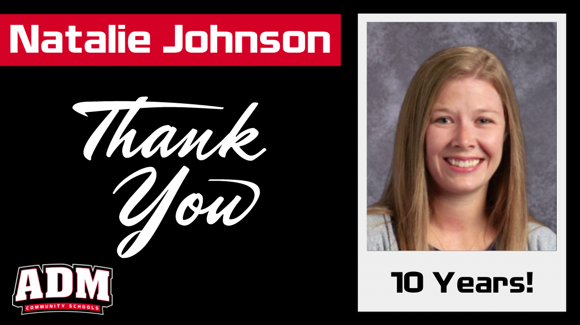 Natalie is a native of Burlington Iowa and is beginning her eleventh year with ADM High School in the language arts department. Natalie is a graduate of Iowa State University and she learned about ADM from a teacher in our district who had nothing but wonderful things to say about our community and the students who attend ADM. She has always had a passion for working with kids and she states “I knew that if I wanted to have an impact that I would need to be invested in the education system.” She stays with ADM because “We have good people at ADM. My students are kind, hardworking, and creative. The staff is amazingly supportive and fun to be around.”