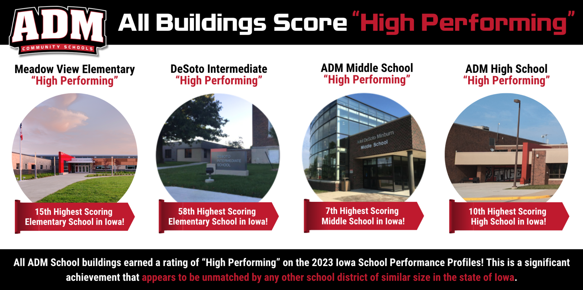 All ADM School buildings earned a rating of “High Performing” on the 2023 Iowa School Performance Profiles (ISPP)! This is the first time that all ADM school buildings have earned this designation and is a significant achievement that appears to be unmatched by any other school district of similar size in the state of Iowa.