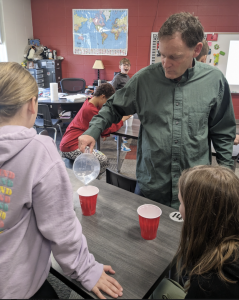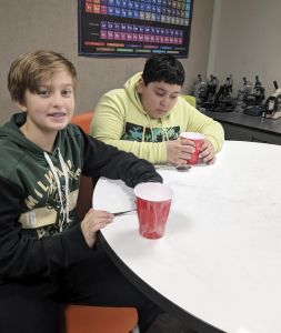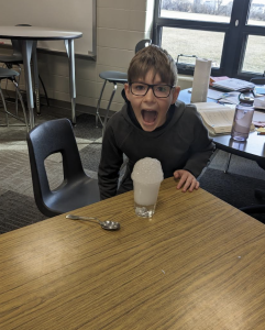 ADM 6th grade students spent a day in science class investigating sublimation by experimenting with the strange properties of dry ice. Dry ice is very cold carbon dioxide which is solid at -109 degrees Fahrenheit. It has no liquid phase, so it sublimates directly from a solid to a smoky fog-like gas, which flows downward instead of up because it is heavier than air. DeSoto 6th graders have been learning about the difference between phase changes and chemical reactions, and how the Law of Conservation of Matter applies to chemical reactions.