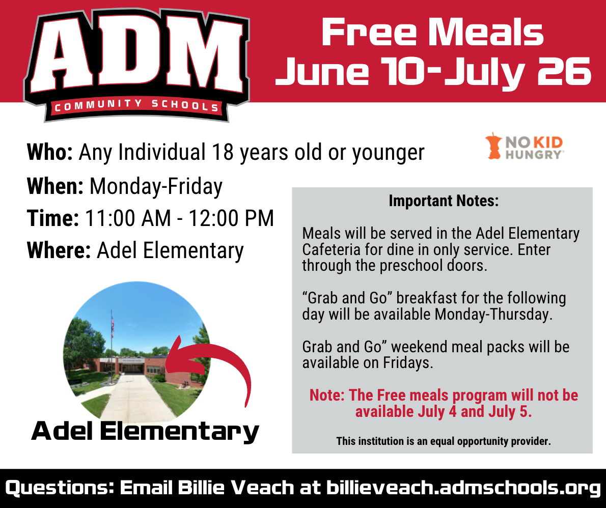 - How It Will Work: Lunch meals will be served for dine-in only service in the Adel Elementary Cafeteria from 11:00AM-12:00PM Monday-Friday.