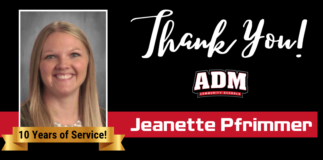 Jeanette Pfrimmer is a Music Teacher at Adel Elementary School and Meadow View Elementary School, serving our Pre-Kindergarten through 4th Grade music students. She is celebrating 10 years with ADM and 15 years teaching musical education. Prior to ADM, Jeanette taught in Deer Park, TX (a suburb of Houston) for 4 years, and spent 1 year teaching at Iowa Christian Academy in West Des Moines. Growing up in the small town of Malvern, IA, she grew to love small town life. She chose ADM because she and her husband were looking for a place to call home and start a family. She’d heard many wonderful things about ADM and was impressed by the positive and dedicated staff she met during her interview process. Jeanette lovingly recalls her first year as a music teacher at Adel Elementary being on a cart (due to construction), she had her cart decorated to the max, complete with a tu-tu that was made up of her movement scarves.
