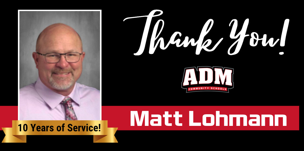 Matt Lohmann is an Assistant Principal at ADM High School and is celebrating 10 years at ADM this year. He grew up in Sumner, IA, or as he calls it, “God’s Country.” He received his BA from University of Northern Iowa and his MA from Viterbo University. Prior to ADM, Matt was a Math Teacher and coach for Waukee Schools. This is his 31st year in education. He wanted to become a teacher because he wanted to help students learn, compete, and reach their highest potential. He chose ADM because he lived here and his children attended school here, and he stays because of the people; the amazing staff, students, and parents. Aside from these amazing people, what he enjoys most about his current role is watching our students excel in school and in their extracurricular activities.