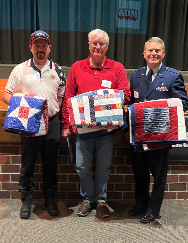 The morning activities concluded with an assembly to honor those who attended the day’s events. As veterans made their way to the auditorium, students lined the halls for a clap out honoring the veterans for speaking and for their service to our country. During the assembly, 4 Quilts of Valor were presented to deserving veterans. Laura Brenner, an Adel community member and retired ADM teacher, made two of these quilts for the ADM Middle School. Kim Timmerman presented these quilts on Laura’s behalf, recognizing Bill Highland, who received his quilt prior to the ceremony, as well as Tim Johnson, who was present to receive his quilt. The remaining two quilts were made by Robbie and Andrew Hall, ADM high school students, as a service project. Robbie Hall presented the quilts to Tim Smith and Scott Mattes to finish the ceremony. Thank you to these individuals for their continued donation of time, talent, and quilts.