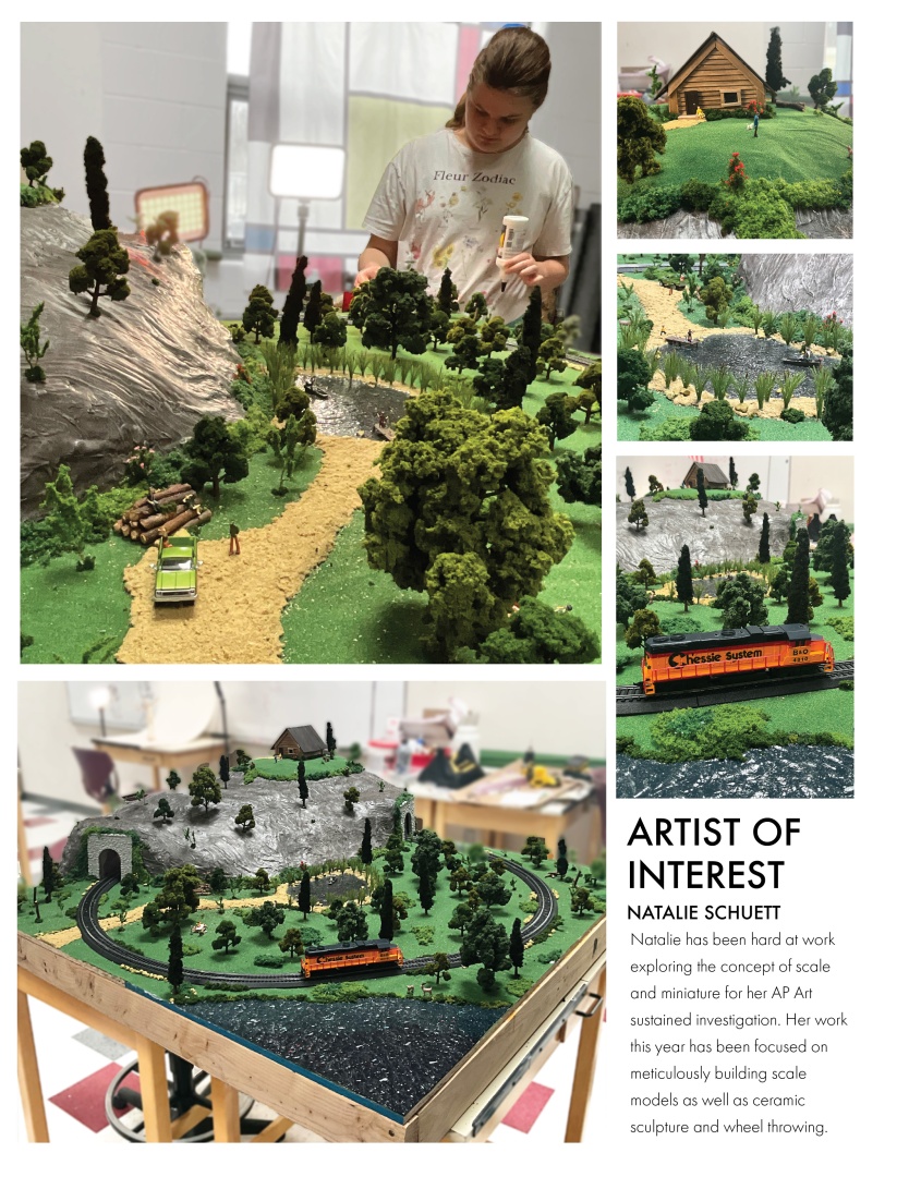 AP Art students were tasked with conducting a sustained investigation where they were able to explore a topic of their choosing across 15 art pieces, five of which showcased their technical skills developed throughout their high school coursework. Natalie has been hard at work exploring the concept of scale and miniature for her AP Art investigation. Her work this year has been focused on meticulously building a miniature landscape for her train. She has also explored ceramic sculpture and wheel throwing as part of her exploration.