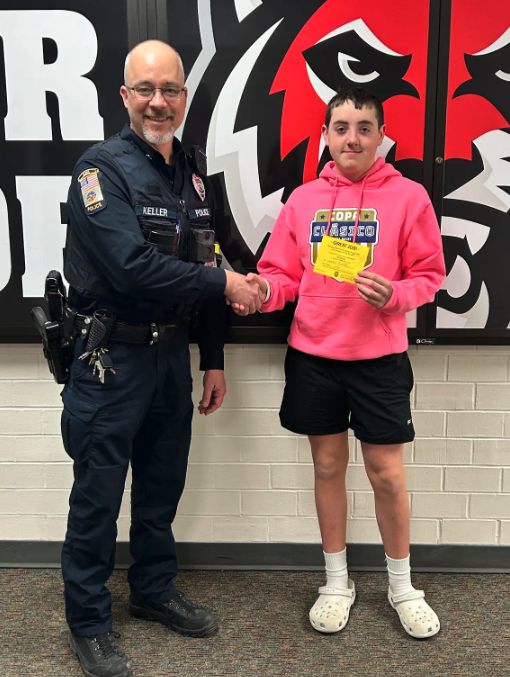 Thank you to Blue Kindness for sponsoring the Middle School Top Notch Tiger. Pictured: Officer Keller awarding Landon Keeble with a free pizza from Dominos.