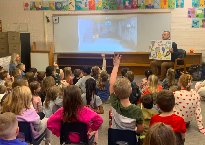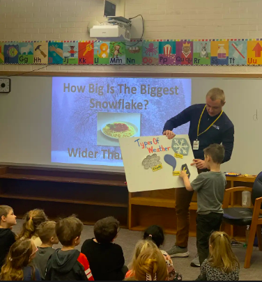 Meteorologist Zane Satre spoke with Kindergarten classes about weather. He discussed different types of weather including snow, lightning, rain, wind, clouds, tornadoes and sun. He connected the types of weather to the seasons. Finally he demonstrated how a cloud is made using a plastic bottle for students to visualize.