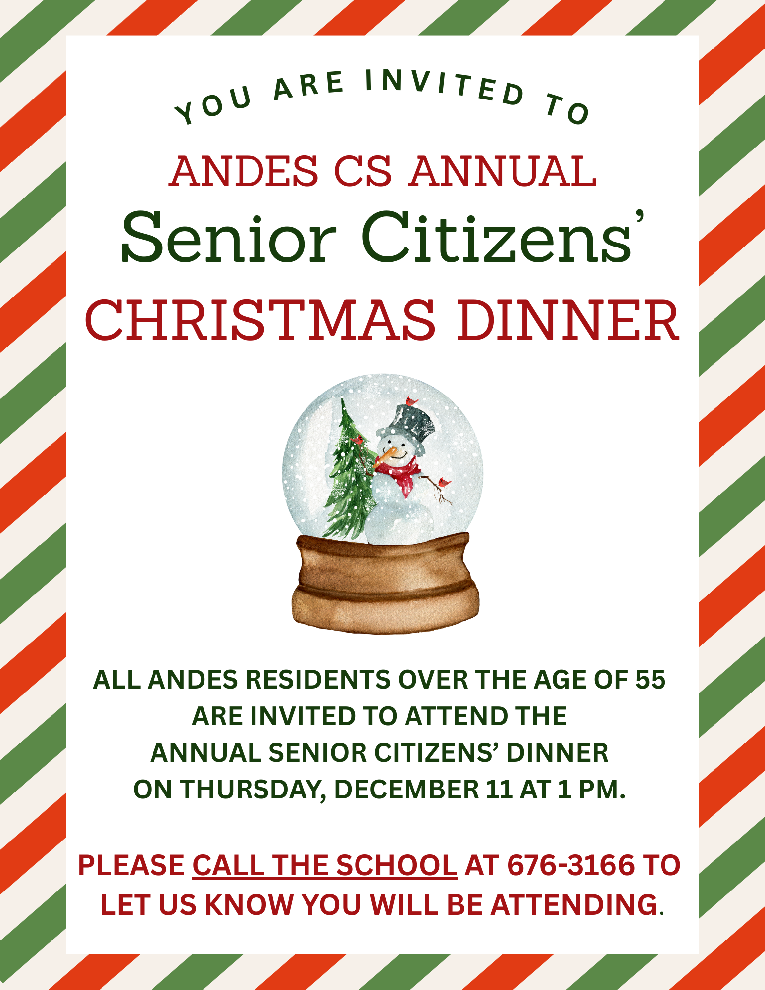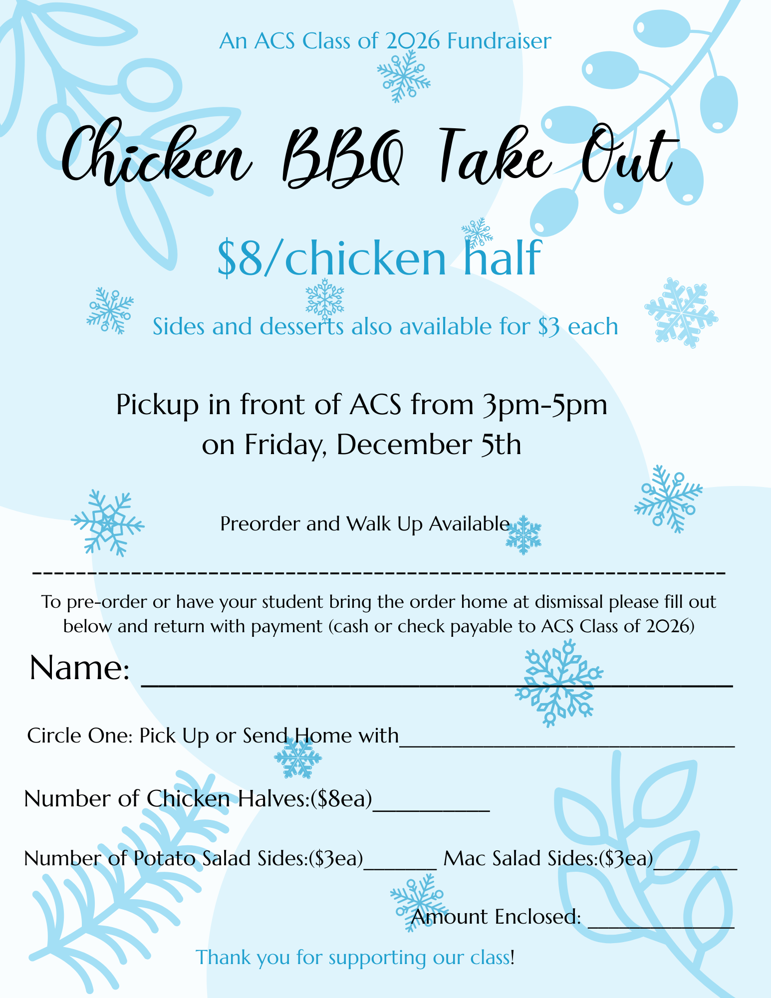 The ACS Class of 2026 is having a Pulled Pork Dinner on Tuesday, December 16th from 4:45-6:15pm.