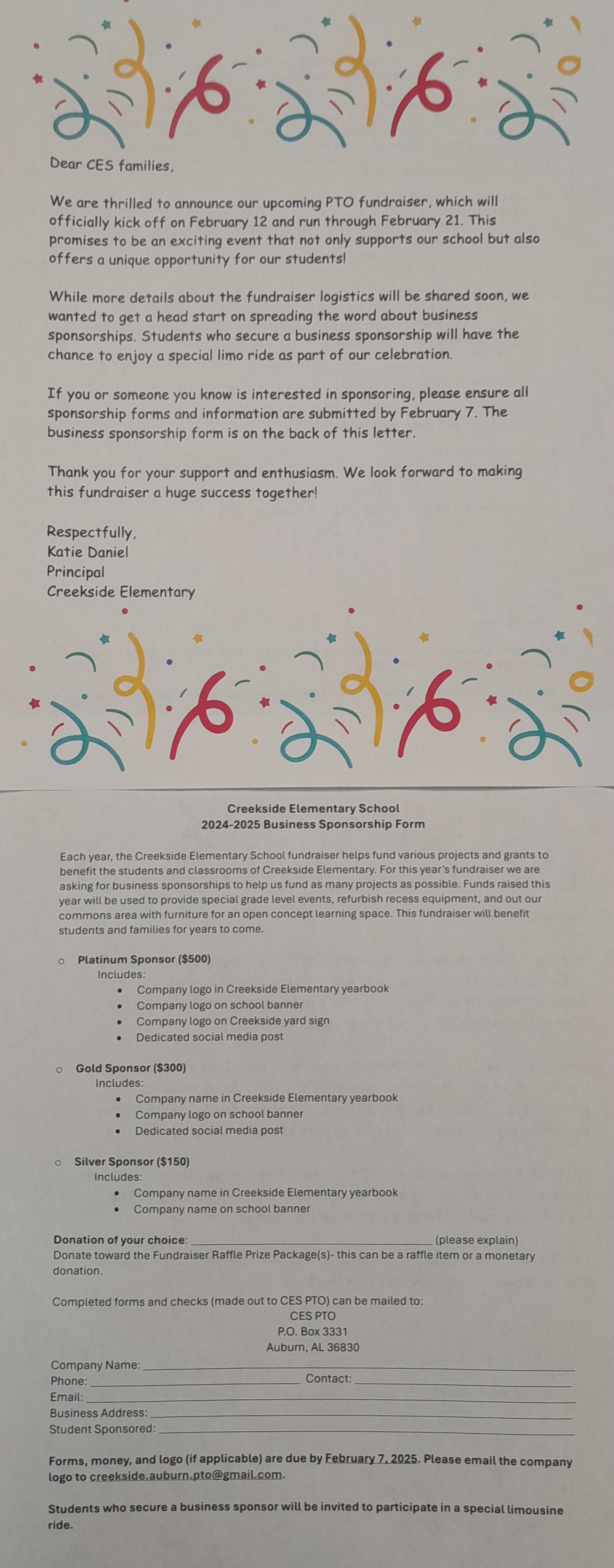 2/12: CES Fundraiser Kick Off- 1:20 to 1:40- click to register your student- business sponsorships DUE 2/7