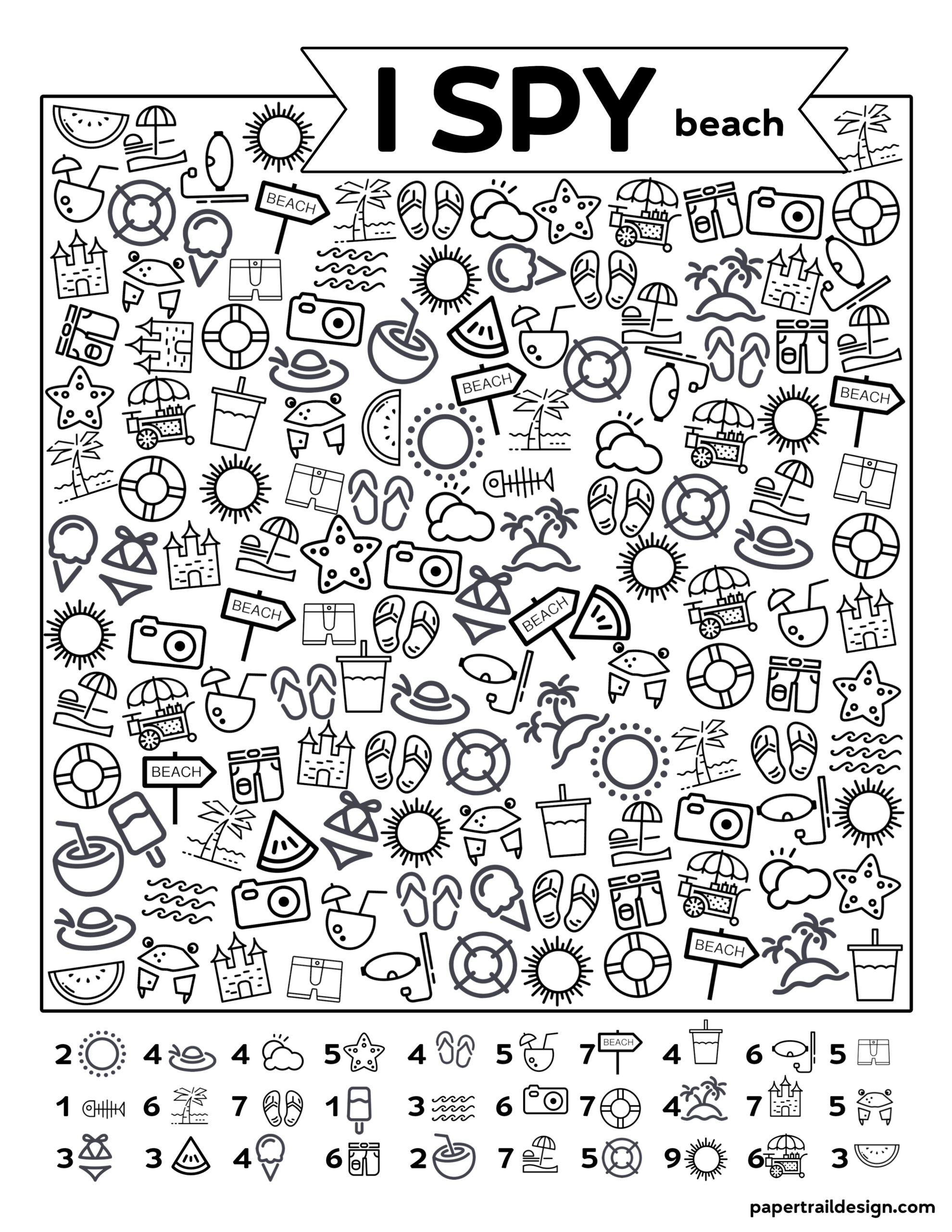 I spy fun! Print and see if you can find all of the objects at the bottom of the page. Color them in as you go!