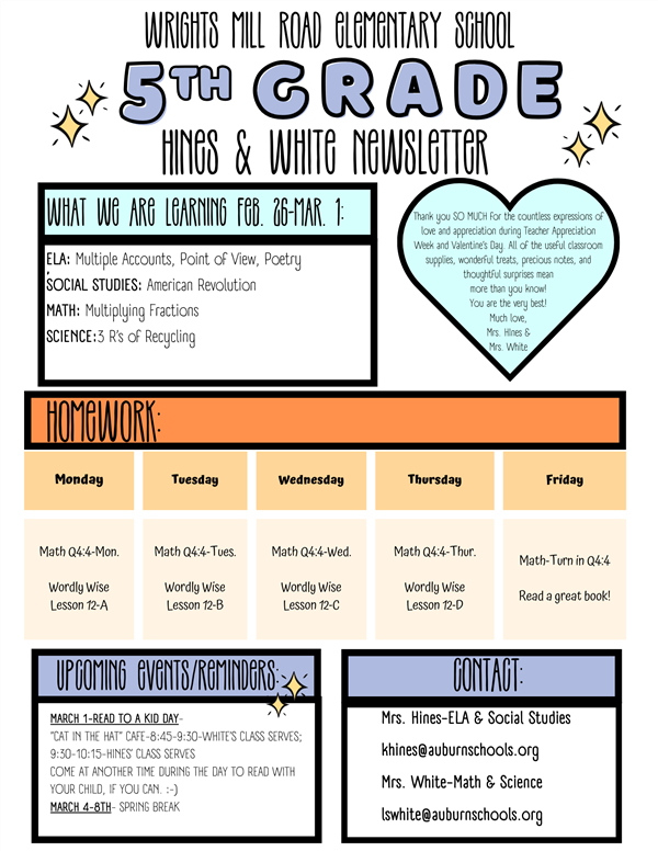 This year is going to be an incredible year of learning, and I am happy to play a small part of your journey. The upcoming 2023-2024 school year will be my 26th year in the classroom, with 25 of them being here at Wrights Mill Road Elementary School.