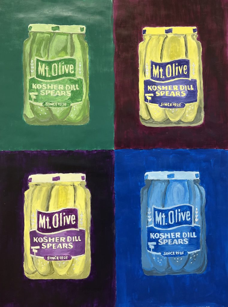 “I drew pickles first and then painted on top of them to represent four different color schemes,” she explained. The artwork allowed her to use color variation to create visual interest, utilizing the color wheel taught to her in art class.