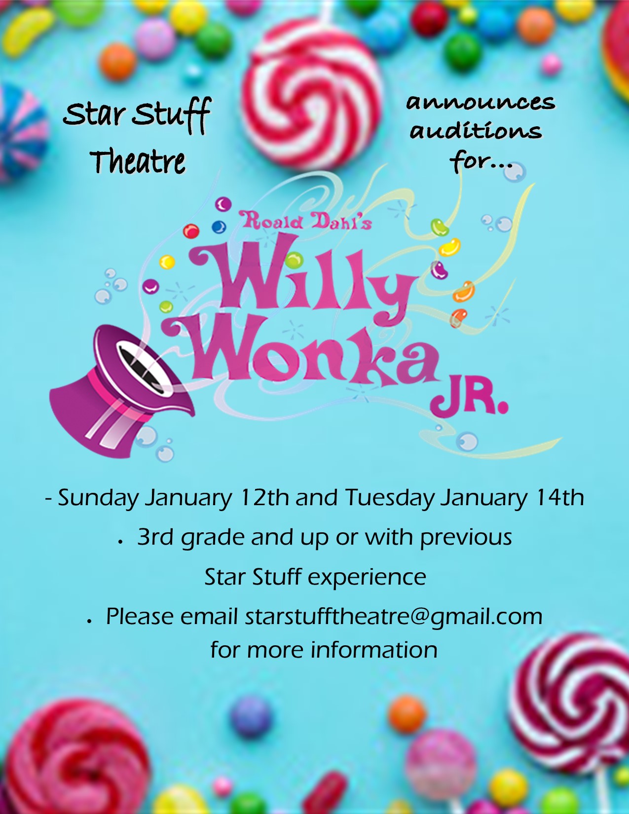 Star Stuff Theatre is excited to announce auditions for "Willy Wonka Jr."! Auditions are open to 3rd - 8th graders, or by director invitation.
