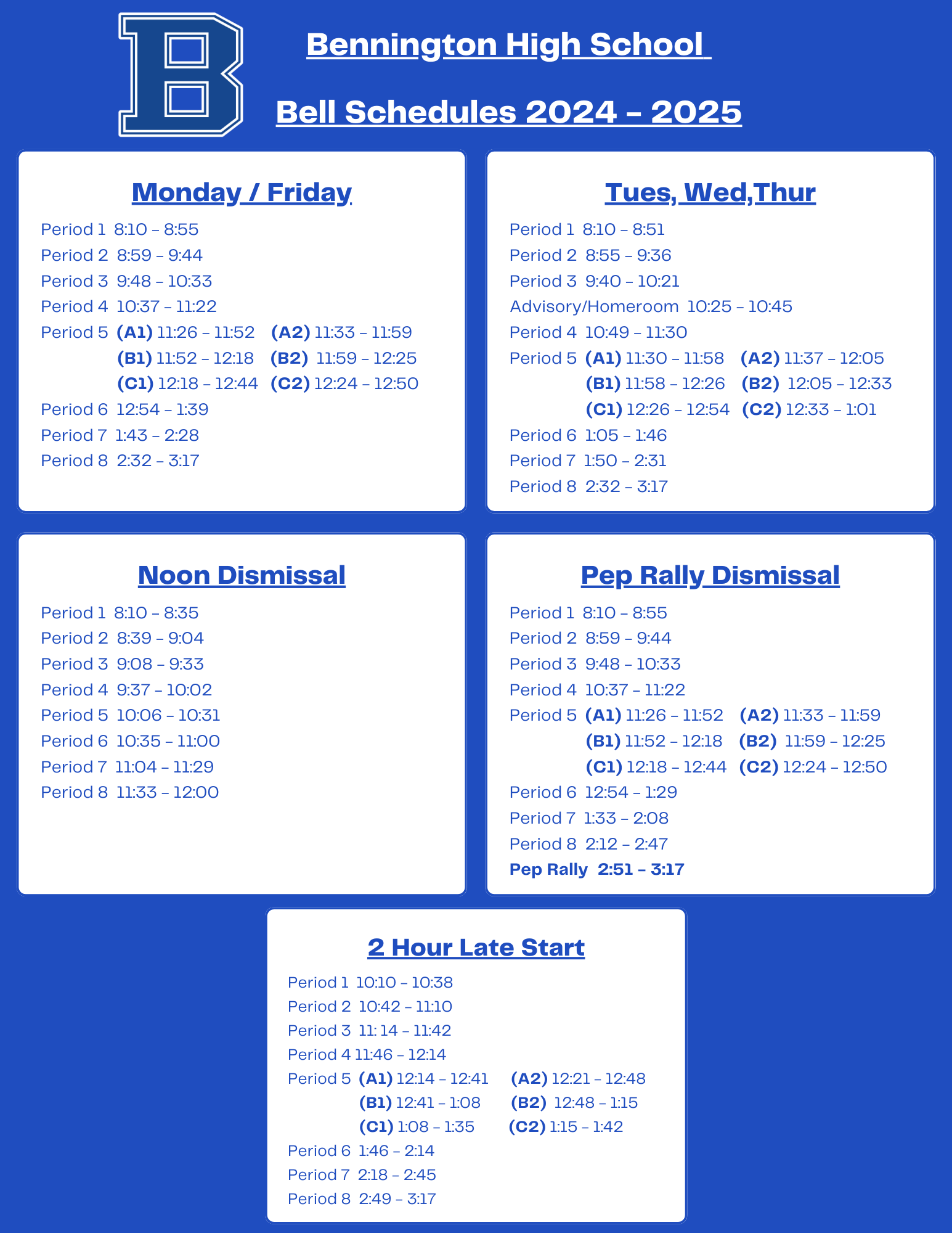 Welcome to Bennington High School.  This year, 1081 students and 80 staff members will work together to continue to create a positive culture of learning in the classroom and in all extra-curricular activities.  In order to maintain our vision of excellence, the school will continue to build our foundation by the search for continuous improvement.   Our three school improvement goals at Bennington High School include:
