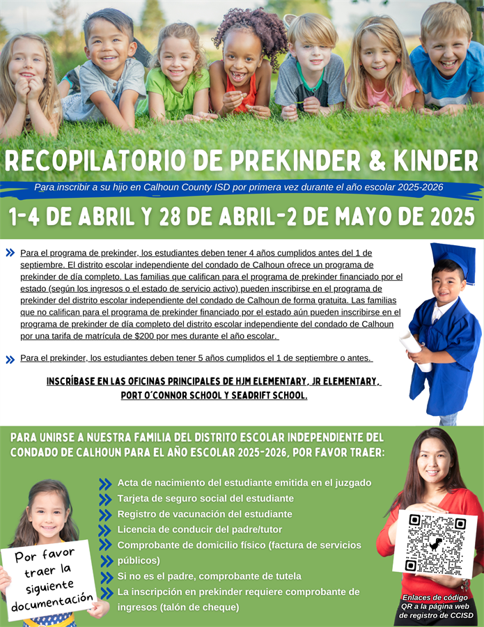 Will your child be attending Calhoun County ISD Pre-K and/or Kindergarten for the first time next school year (25-26)? Let's get them enrolled!