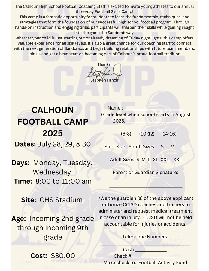 Join us and get a head start on becoming part of Calhoun's proud football tradition!