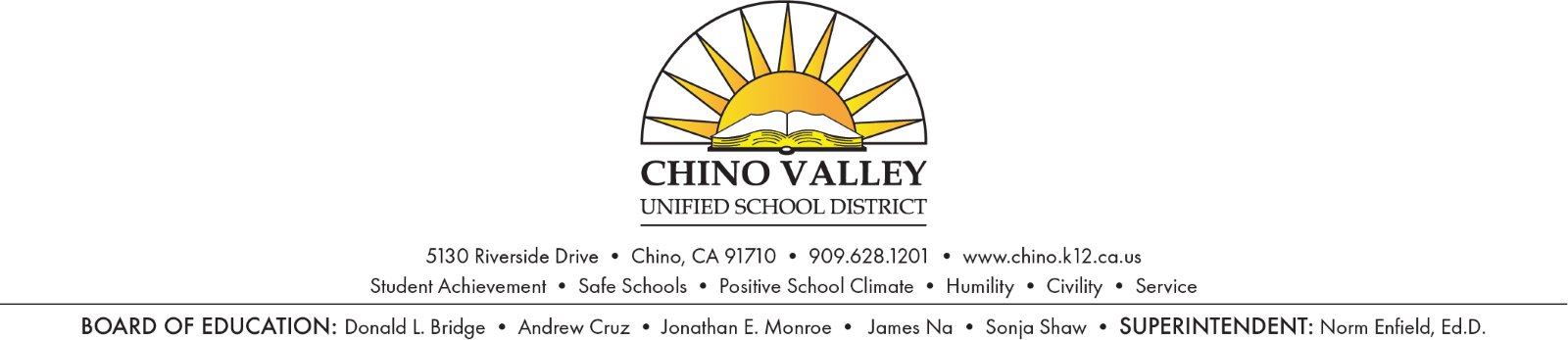Students taking advantage of the school bus services must apply for a bus pass, free of charge, through the District’s Transportation Department. Information on how to acquire a bus pass can be found at https://www.chino.k12.ca.us/Page/56130.