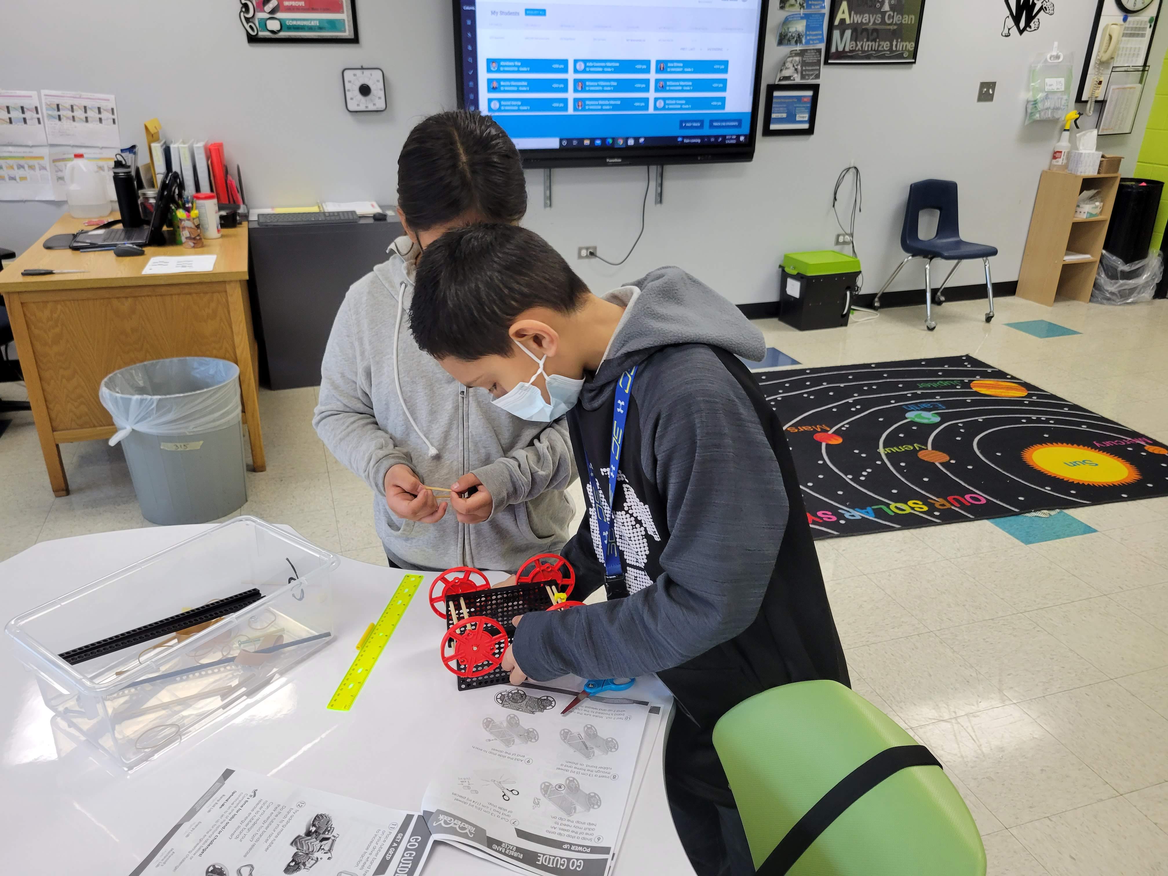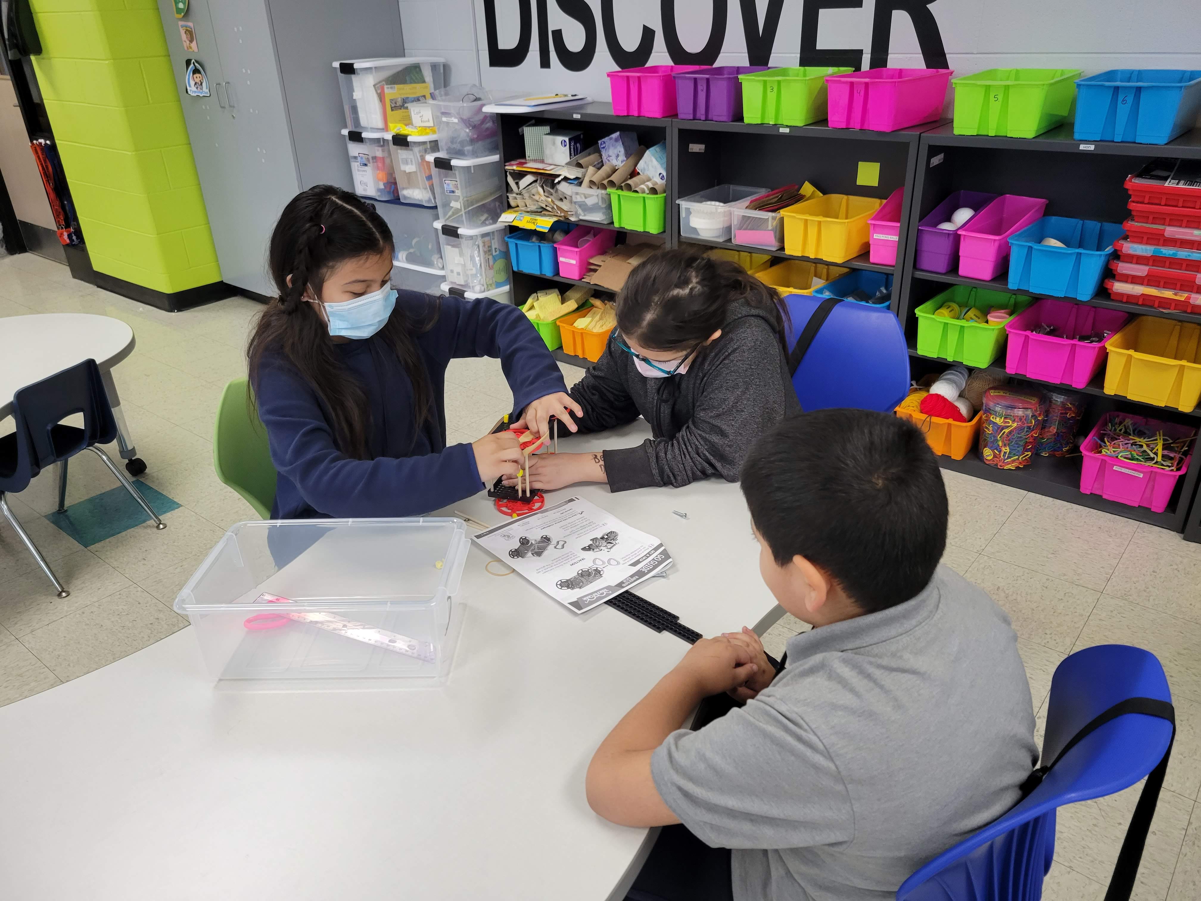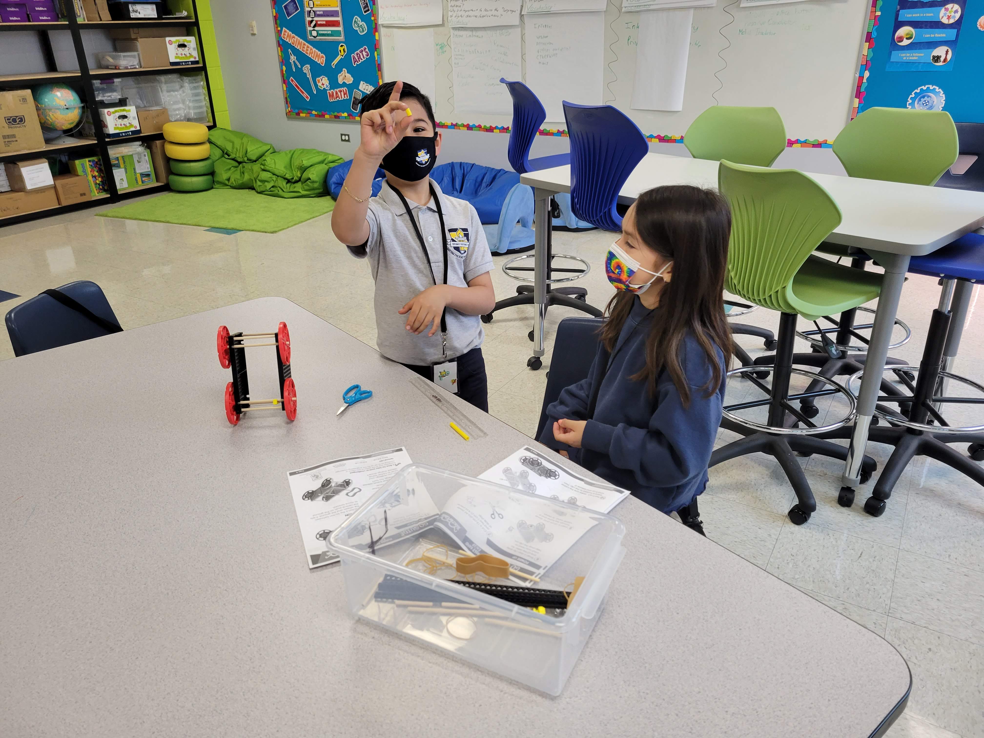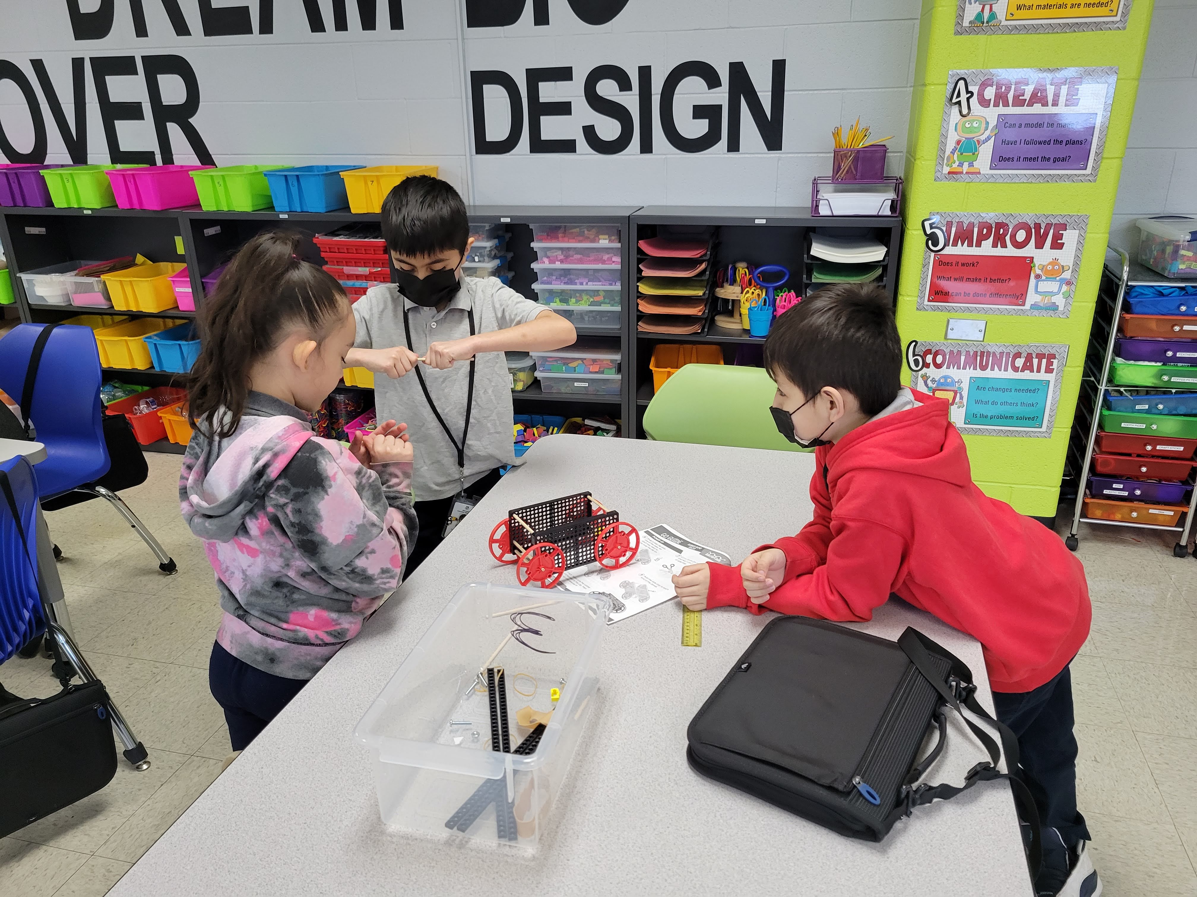 Third grade students from Ms. Bystrianski and Mr. Melka's class work in groups to design and create racer cars in STEAM class. Students learn how to be mechanical engineers by building their own racer cars using the energy stored in rubber bands.