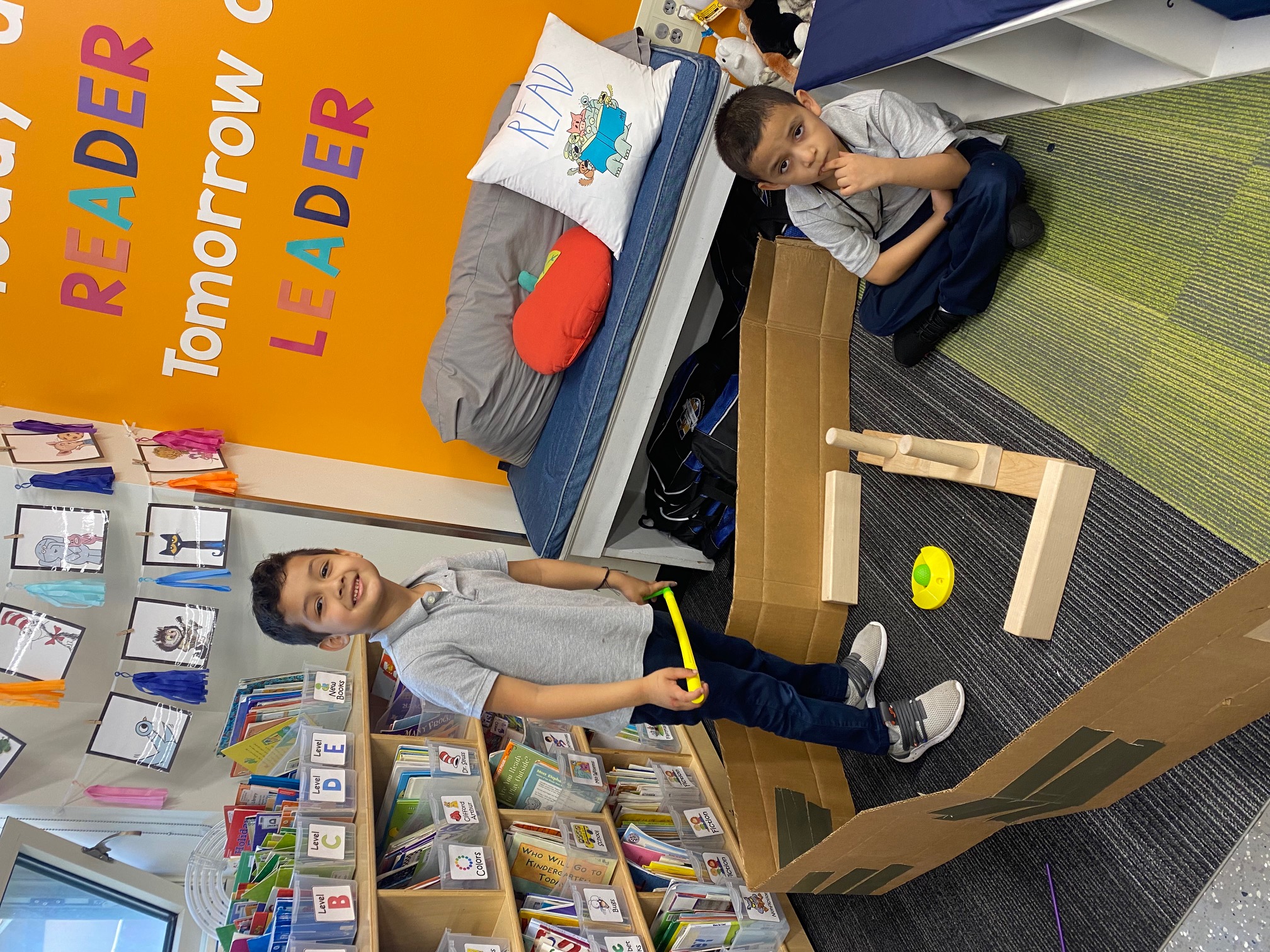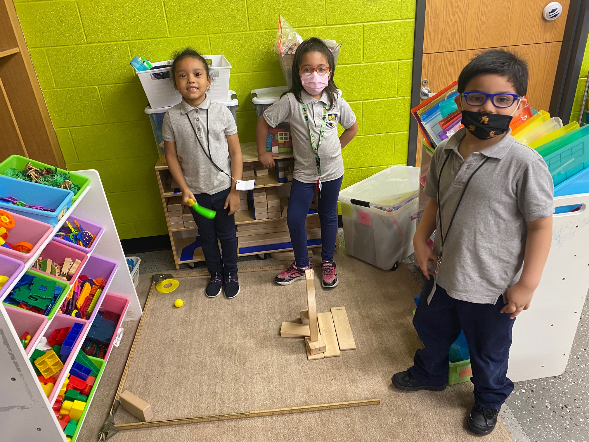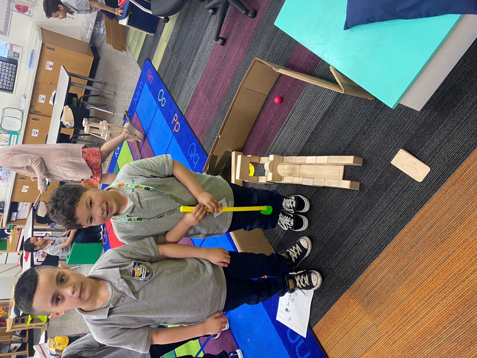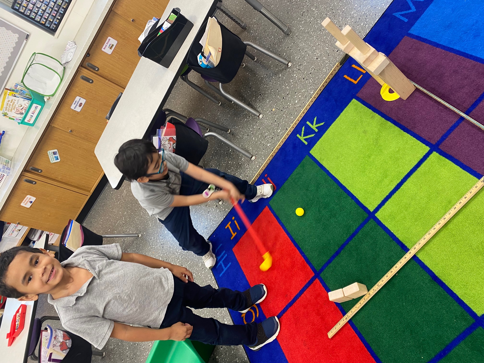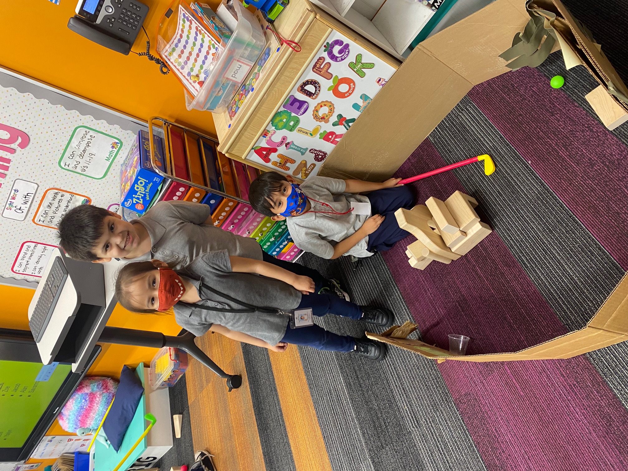 Students in Ms. Loney's kindergarten class designed miniature golf course holes to explore what they have learned over the past few weeks about pushes, pulls, and motion. Students had to include a hard push, a soft push, a pull, a collision resulting in a change of direction, and an obstacle.