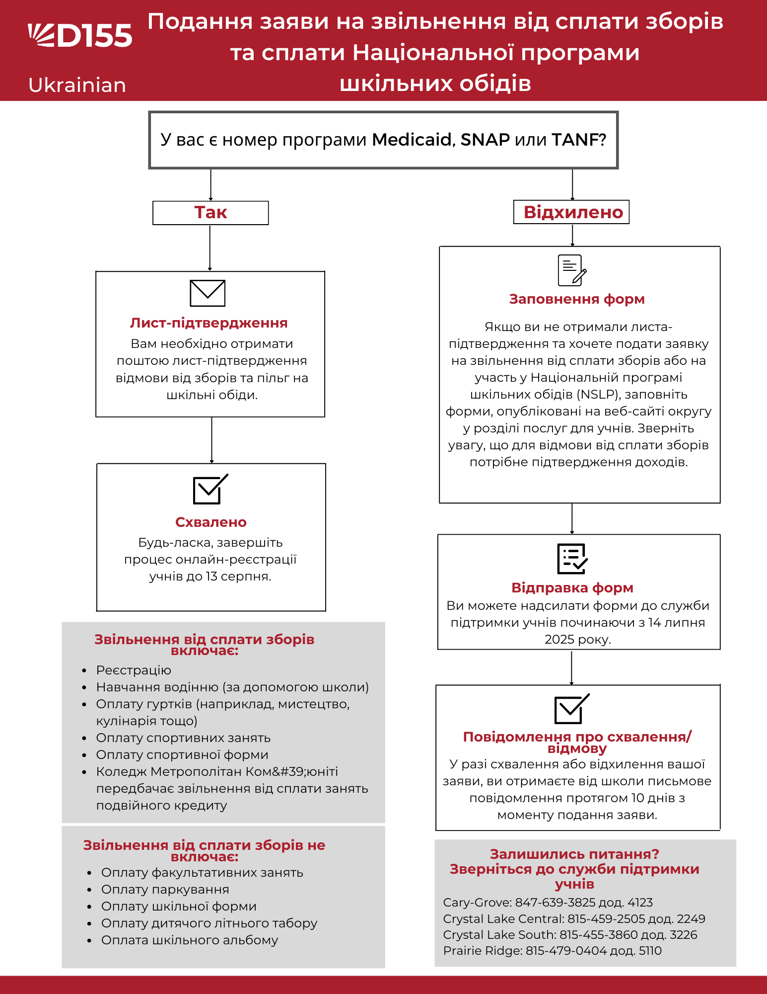 Parents and guardians can pay registration fees online through Skyward Family Access. After logging in, go to “Fee Management” to pay the fees associated with your student. If you do not have computer access, you may pay online at the District Office (1 S. Virginia Road, Crystal Lake) or pay by check or cash. *The District Office will be closed on June 19, 2025.