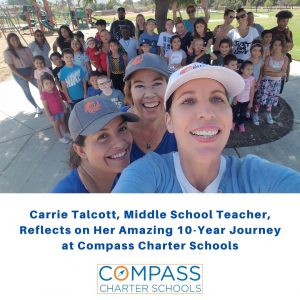 Carrie Talcott, our beloved Middle School Teacher, has been with Compass Charter Schools since its inception in 2011. Carrie earned her Associate of Arts Degree in Liberal Studies at Citrus College, her Bachelor of Arts Degree in Child Development, Preliminary Multiple Subject Teaching Credential, and Clear Multiple Subject Teaching Credential at California State University, Northridge. While at Cal State Northridge, she met her friend Melanie Rodriguez, who later asked her to develop Compass Charter Schools. J.J. Lewis was the board president at the time, and he was doing exceptional work to support the school’s development.
