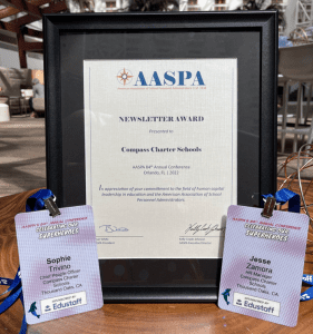 Thousand Oaks, CA – Compass Charter Schools has been selected by the American Association of School Personnel Administrators (AASPA) Recognitions Committee and Executive Board to receive the 2022 AASPA Newsletter Award for our Compass culture eNewsletter, The Compass Way. The Newsletter Award is given on the basis of a district’s newsletters, which are judged on their content and layout. Compass was recognized at an Awards Luncheon today, Tuesday, October 11, 2022, at the AASPA Annual Conference in Orlando, Florida. Sophie Trivino, Chief People Officer, and Jesse Zamora, Human Resources Manager, accepted the award on behalf of Compass.