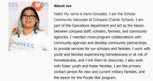 Karla Gonzalez, our Scholar Community Advocate, supports and advocates for McKinney Vento scholars and acts as the liaison between Compass staff, scholars, families, and community agencies. She maintains cross-program collaborations with community agencies and develops community partnerships to provide services for our scholars and families. Karla works with youth and families experiencing homelessness or at risk of homelessness and links them to resources. She also works with foster youth and foster families and is the primary contact person for new and current military families and the liaison for the Purple Star Program.