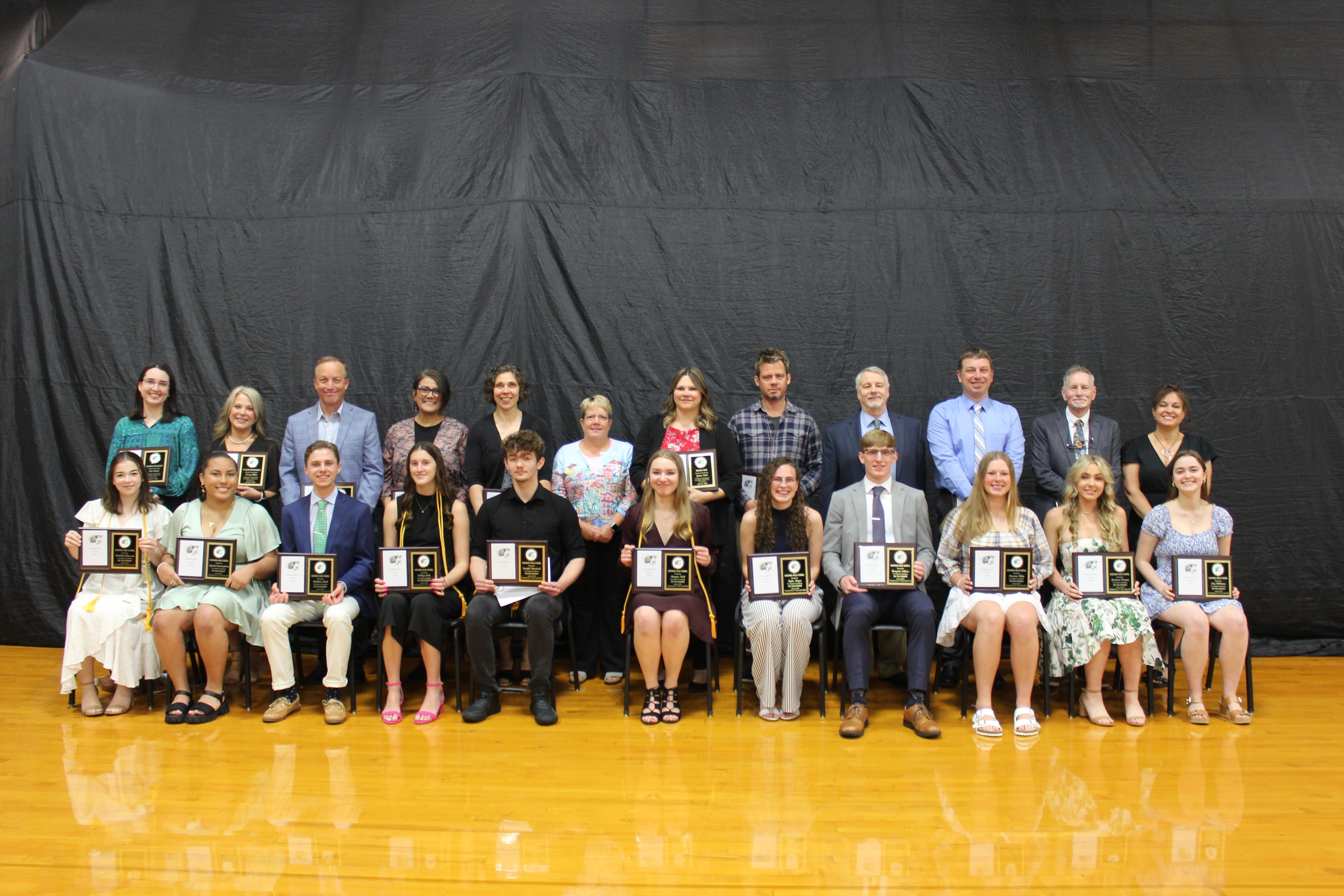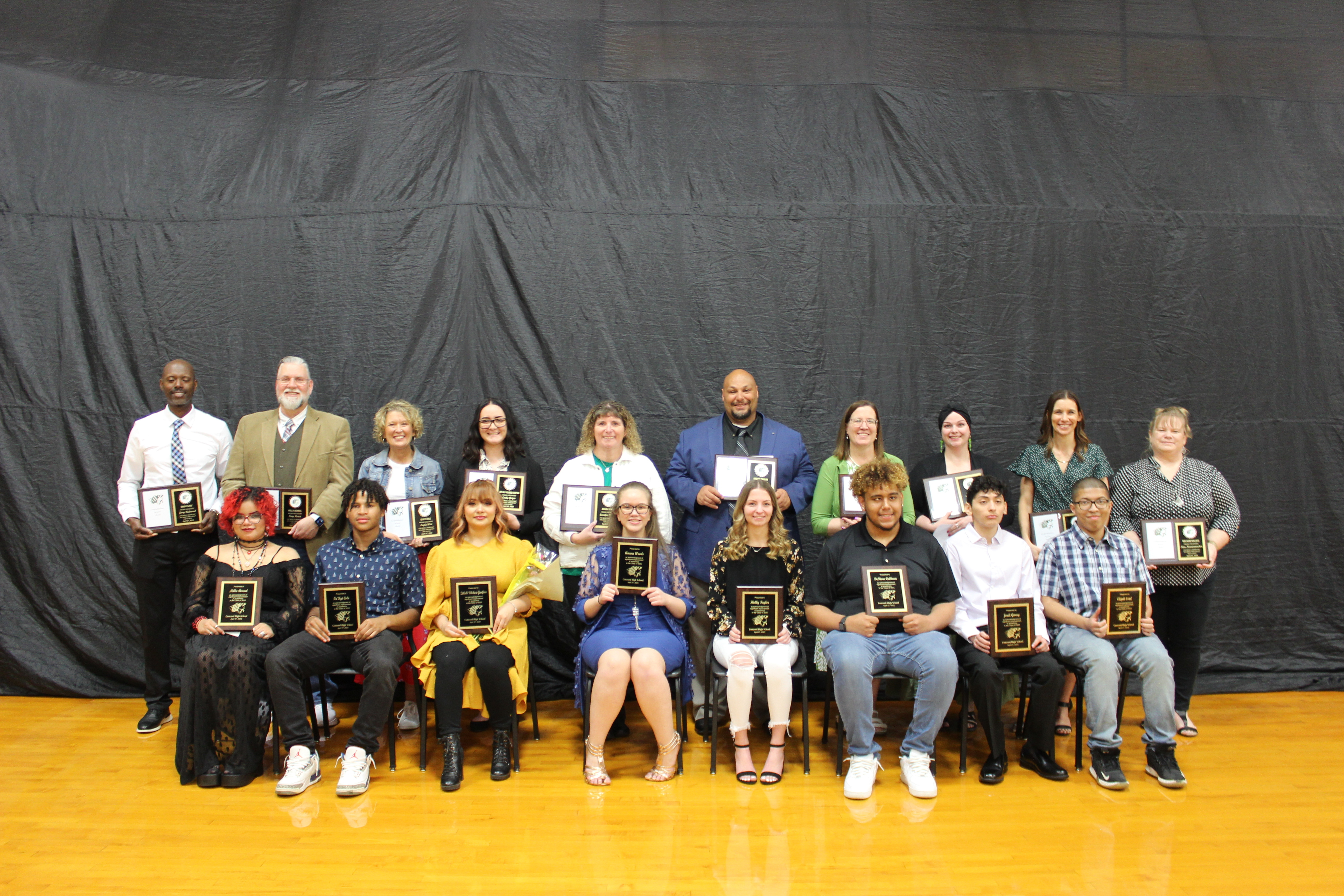 The Top Ten Most Improved Seniors recognized a staff member who had a significant influence on their education. Students are seated in front of the staff member.