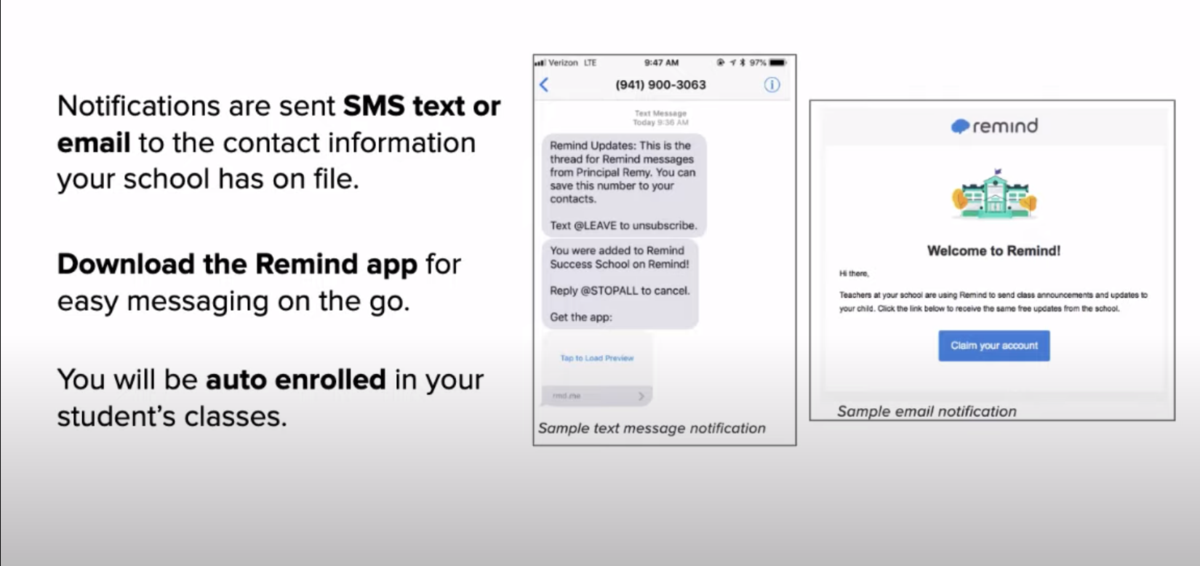 By now you most likely have received a text message, email, or app update from a teacher or principal via Remind. You may be asking, What is Remind? How do I update my settings? OR, if you haven't received a message, How do I join Remind so I don't miss important information? Here is a guide to help you successfully connect with your teacher and school. In these challenging times, communication is key for all of as as we navigate through this year. If you do not have a Remind Class Code or a School Code, please contact your child's teacher or school.